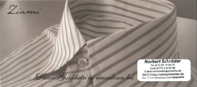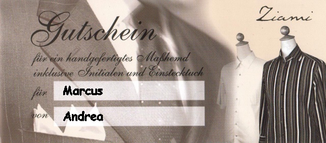 Verschenken Sie doch mal ein Masshemd!Man möchte jemandem eine Freude bereiten und ihm ein perfektes Hemd schenken - nur wie ohne die Maße oder die bevorzugten Farben bzw. Schnittmuster des zu Beschenkenden zu wissen? Ganz einfach, verschenken Sie doch das individuelle Masshemd als Gutschein! Ein solcher Masshemden-Gutschein als hochwertiges Druckstück könnte etwa so wie auf den folgenden Bildern aussehen:![]() ![]() ![]() ![]() Sie wollen einen solchen Gutschein erwerben? Dann rufen Sie einfach die im untersten Bild zu sehende Telefonnummer an oder schreiben Sie eine eMail! |